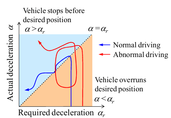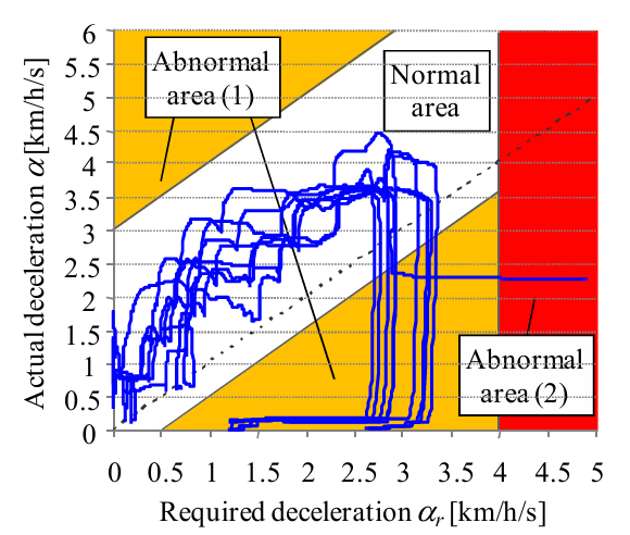 正常駕駛行為與異常駕駛行為有明確的不同,故可以在期望加速度-實際加速度圖上規範出「異常區域」。以列車的減速行為有無進入此異常區域來判斷是否為異常狀態。