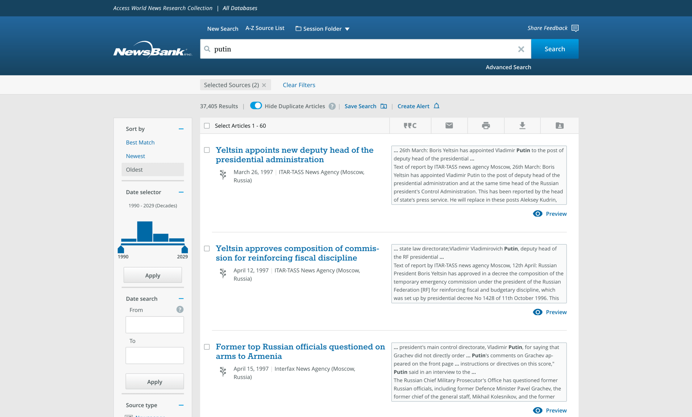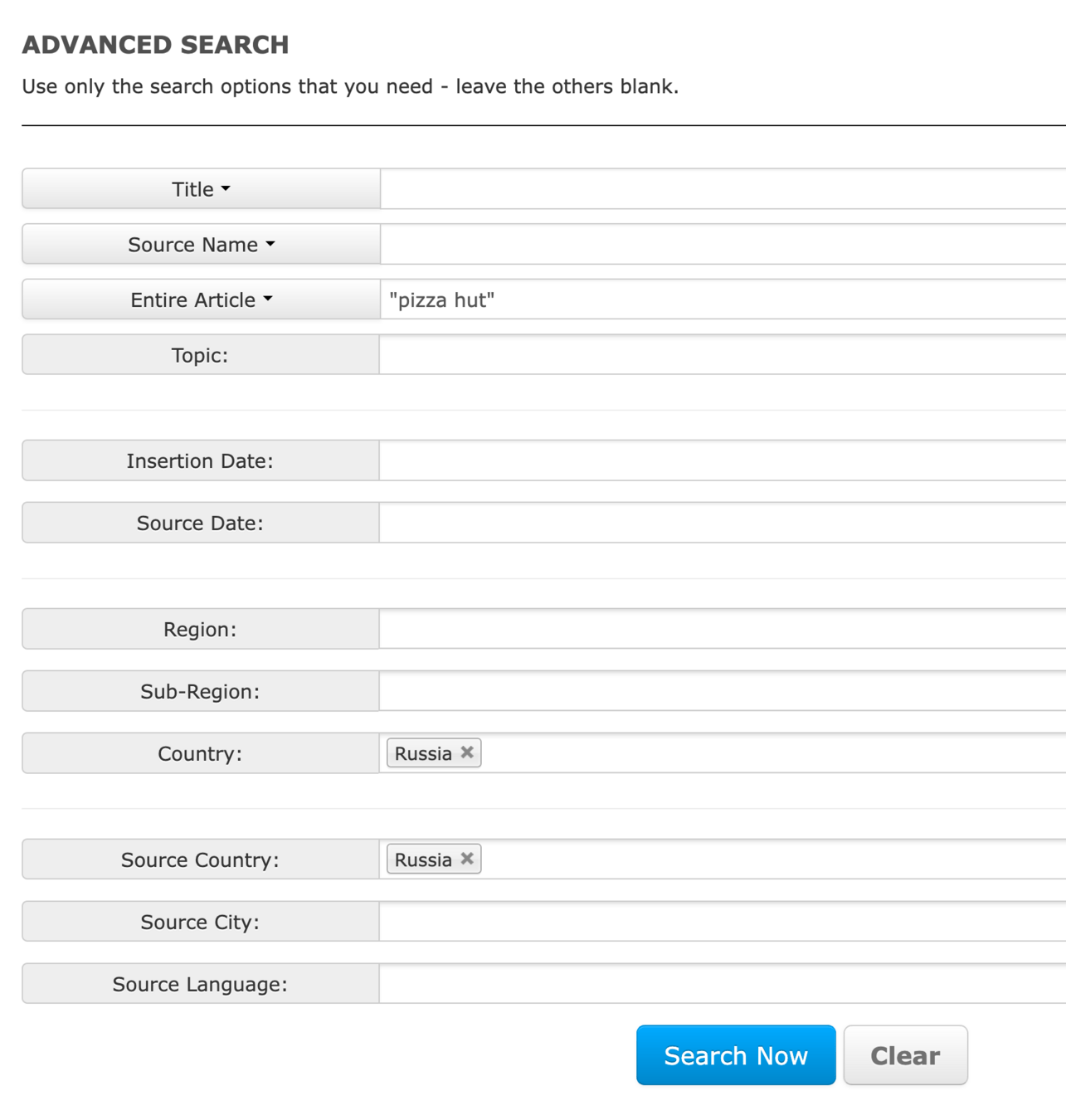- To find articles published in Russian news outlets, use Source Country