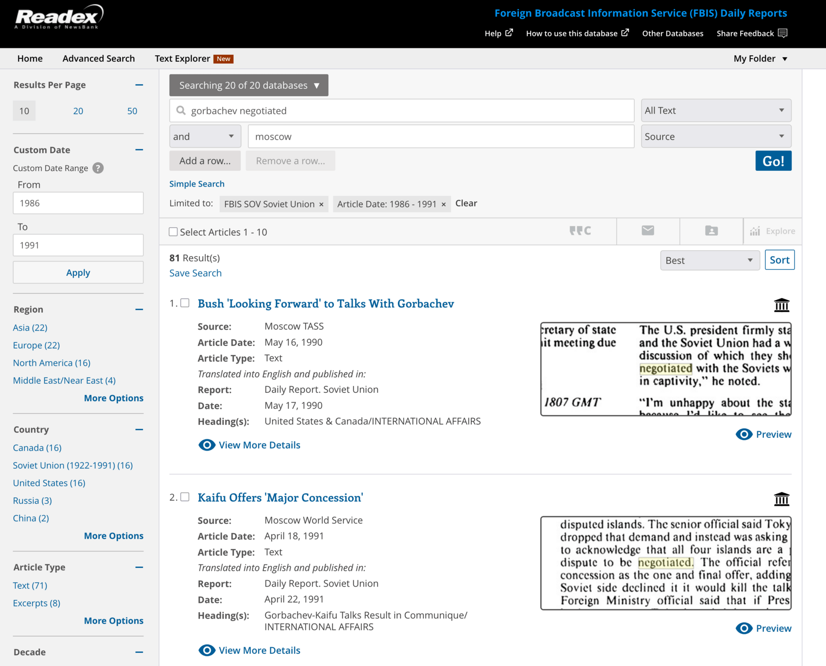 Searchable database of translated news articles and broadcasts from 1941-1996