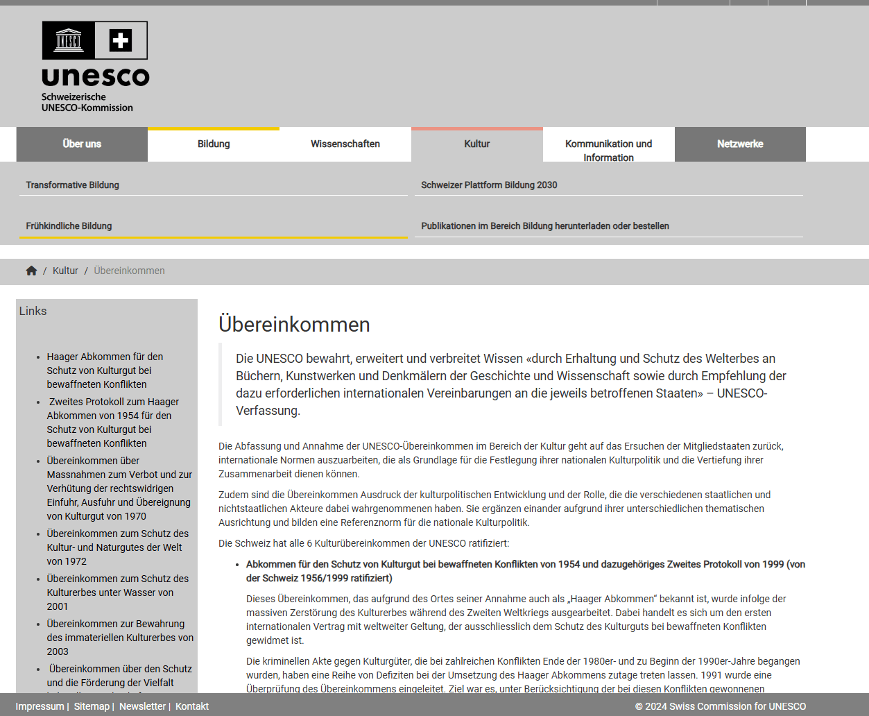 Übereinkommen über Massnahmen zum Verbot und zur Verhütung der rechtswidrigen Einfuhr, Ausfuhr und Übereignung von Kulturgut von 1970 (von der Schweiz 2003 ratifiziert)