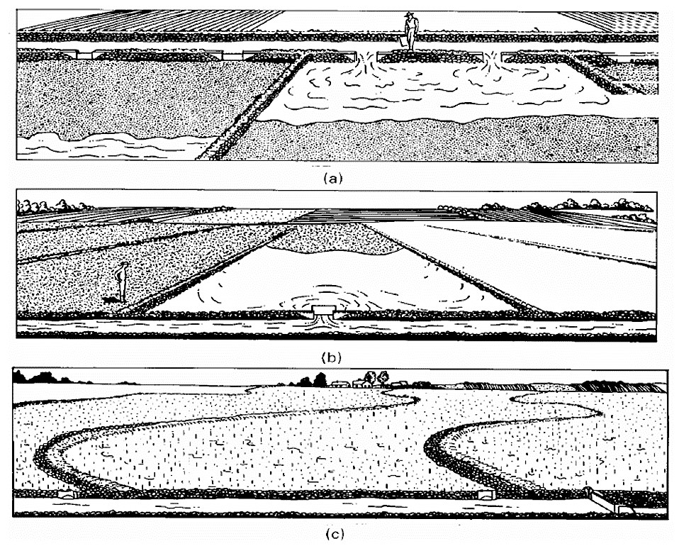 Examples of border irrigation systems. (a) Typical graded border irrigation system. (b) Typical level border irrigation system. (c) Typical contour levee or border irrigation system. Source: WALKER (2003) link